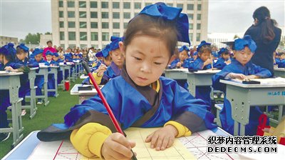 9月1日开学第一天,西宁市阳光小学为新入学的孩子们举办了开笔礼,仪式分正衣冠、朱砂启智、启蒙描红、感谢恩亲、击鼓明志、礼成合影六部分。开笔礼是中国传统文化中少儿开始识字习礼的重要仪式,是一种流传久远的儿童启蒙教育方式。小小的开笔礼,包含着厚重的中国文化气息,蕴含着求学问道、安身立命的深刻涵义。图为孩子们在老师的指导下学写“人”字,在人生的启蒙阶段,教导孩子们要像“人”字那样顶天立地。(莫昌伟 赵静 摄)